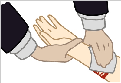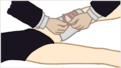 И как и в случае с искусственным дыханием - первым делом нужно подумать о собственной безопасности. Если это незнакомый человек, нужно исключить прямой контакт с его кровью. Для этого в аптечке есть перчатки. Для остановки кровотечения (в общем случае) нужно: 1. Зажать рану рукой, платком или куском ткани. Если есть возможность - поднять раненую конечность вверх, чтобы уменьшить давление крови в месте ранения. ![]() (Если ранена рука ниже локтя или нога ниже колена - согните локоть или колено. Таким образом, можно снизить ток крови к кровоточащей ране.) 2. Наложить давящую повязку ![]() (Положите на рану марлевую салфетку или сложенный платок. На салфетку подложить что-то твердое, например моток бинта или мобильный телефон. Забинтовывать следует по направлению от раны к сердцу - чтобы в конечности осталось как можно меньше крови - это поможет снизить боль. Если нет под рукой бинта - используйте кусок ткани или туалетную бумагу. Закрепить повязку можно булавкой или пластырем). Если повязка получилась не плотная и пропиталась кровью - не снимайте ее. Наложите еще одну повязку поверх нее. ![]() Ни в коем случае нельзя извлекать предметы, находящиеся в ране - это может значительно усилить кровотечение и повредить ткани. Если из раны торчит ранящий предмет или кость - сделайте из марли и ваты тампон в форме бублика, который будет его окружать и закрепите его повязкой. 3. При сильном кровотечении необходимо передавить артерию при помощи жгута. ![]() На теле человека есть только 4 места, где можно успешно наложить жгут - вверху ноги и вверху руки. Даже если кровотечении в области кисти или стопы, жгут накладывают в верхней части конечности. Жгут можно сделать из ремня, веревки, скрученного куска ткани. Под жгут нужно положить полотенце или кусок ткани). ![]() Жгут необходимо снять через 30 минут, чтобы он не привел к атрофии нерва. Если при снятии жгута возобновляется кровотечение - необходимо наложить поверх раны еще одну давящую повязку. Далее: Как вызвать скорую? | |